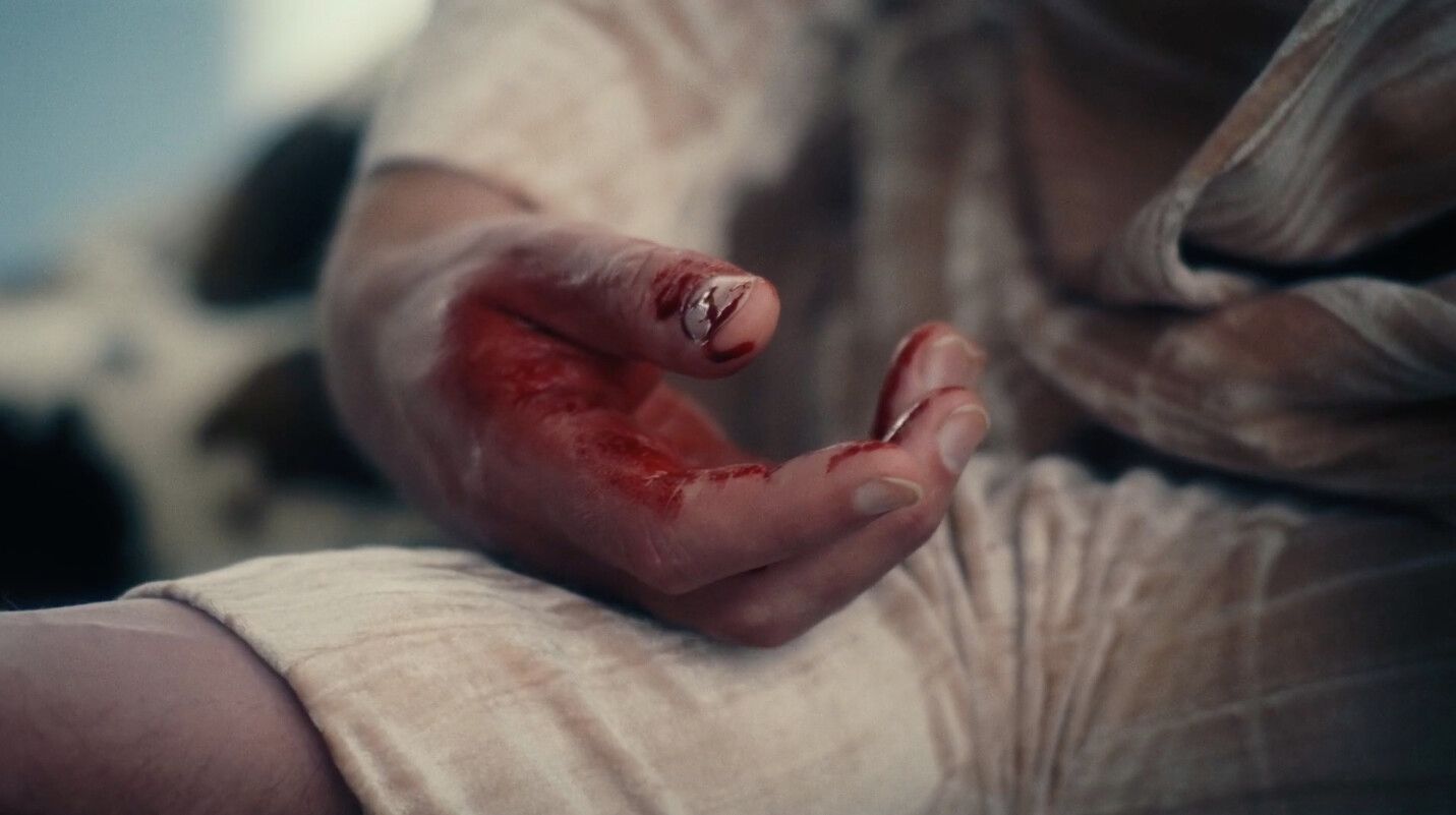 The man begins to touch the woman's body, leaving golden traces on her skin. They then passionately begin to drink each other's blood from their necks. Satisfied, the man draws a golden spiral on the woman's abdomen with his finger and leaves.