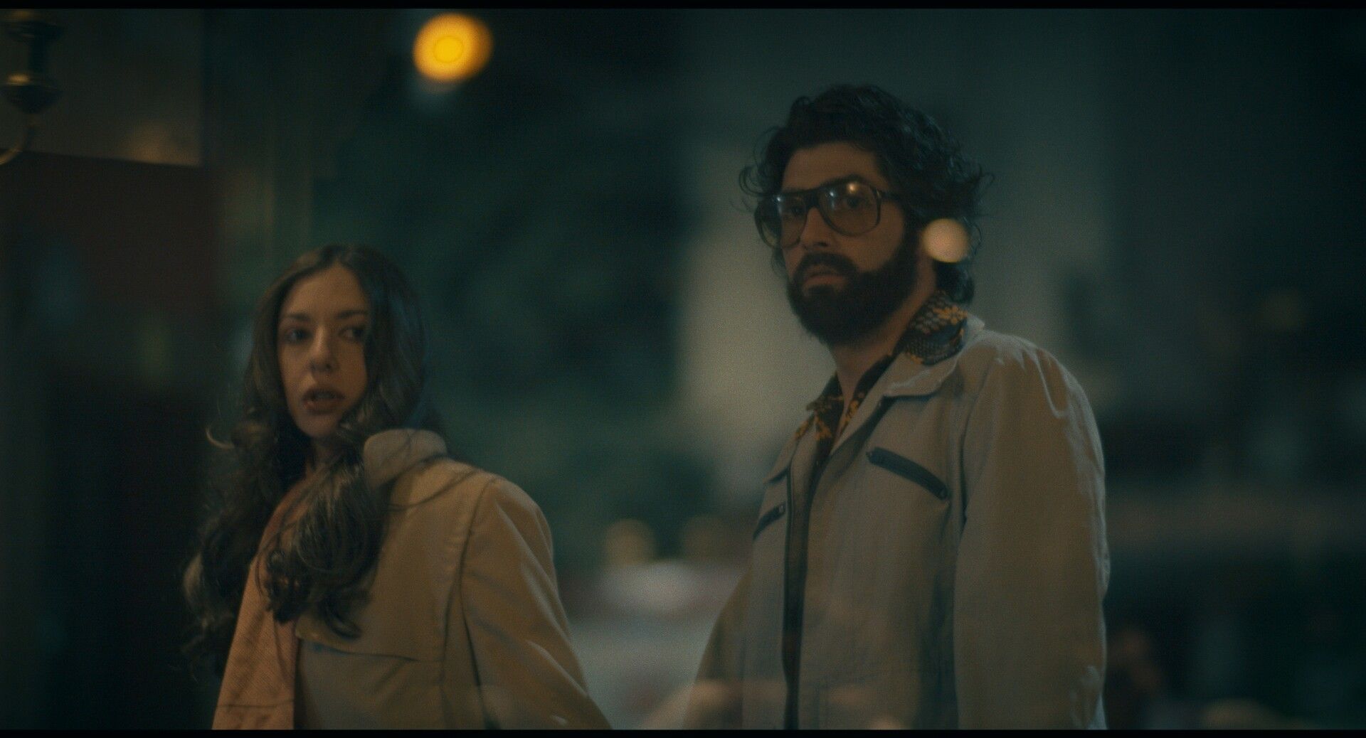 In a dimly lit room, a young man and woman are present. The man's clothing resembles the hippie style of the 1970s, while the woman is dressed in nothing but a robe.